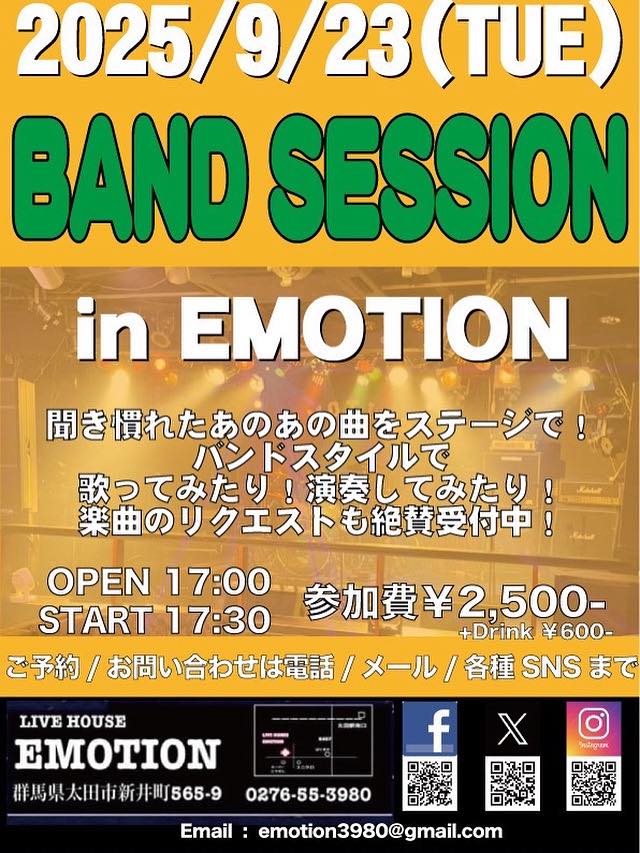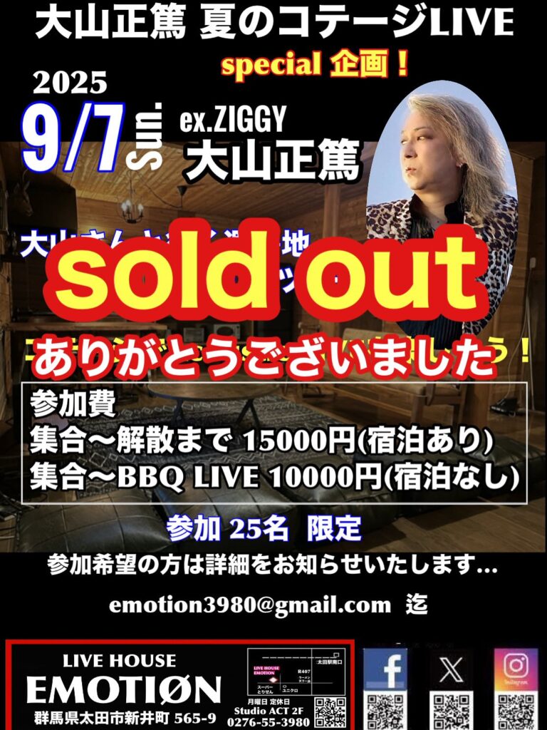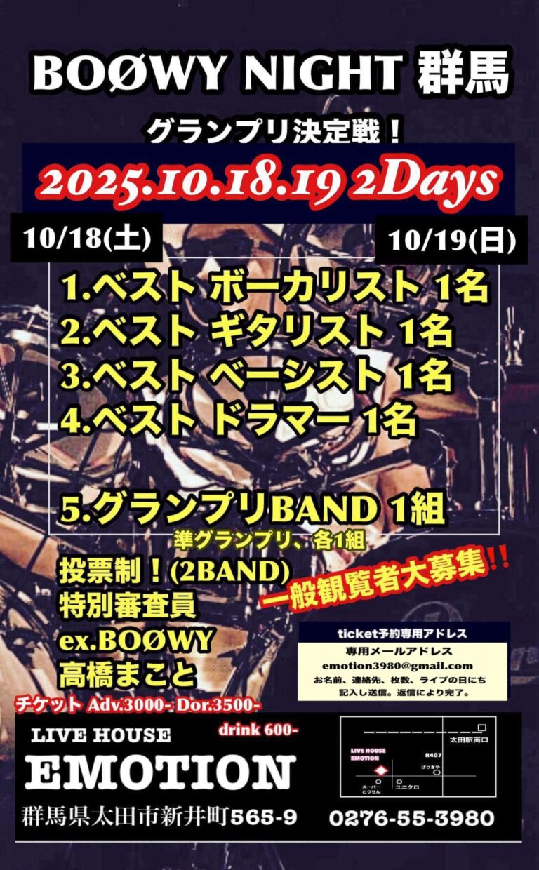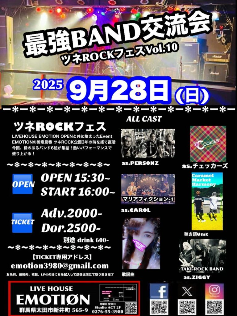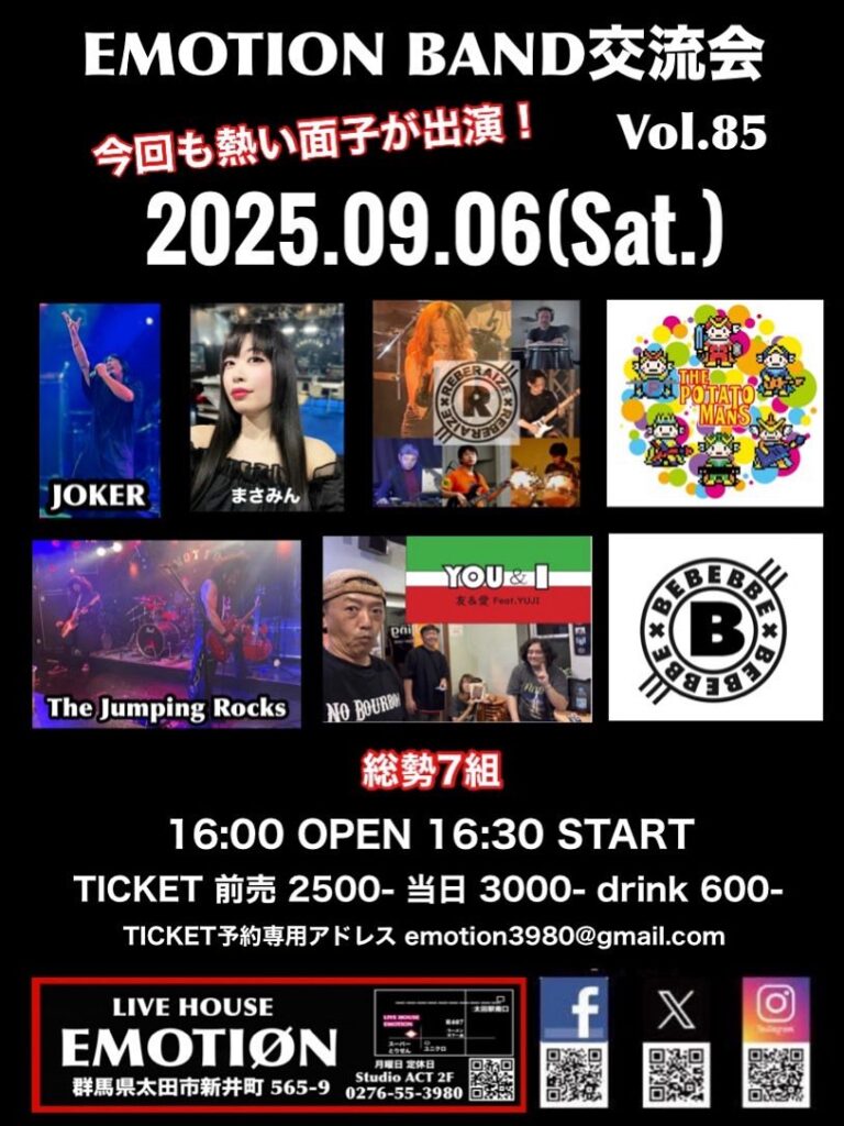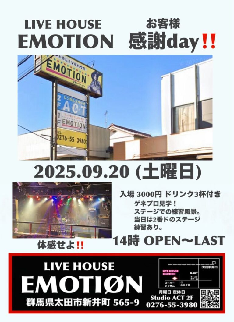 Facebook X-twitter Youtube MENU Gunma Ota CityLive House EMOTION Gunma Ota City Live House EMOTION Gunma Ota City Live House EMOTION Facebook Twitter Youtube SCHEDULE STUDIO ABOUT ACCESS お問合せ Facebook Youtube X-twitter SCHEDULE STUDIO ABOUT ACCESS お問合せ TOP>